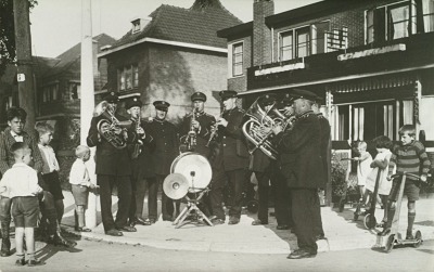 Werkelozenmuziekkorps op de Korte Scheidingsweg.