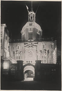 Verlichte Groothoofdspoort aan de rivierzijde.