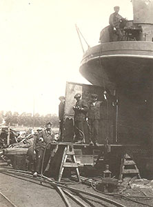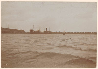 Het eerste zeeschip in de nieuwe Zeehaven.