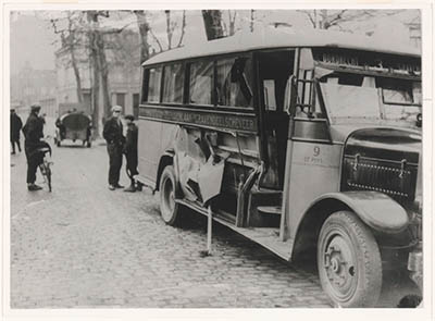 Een door een aanrijding beschadigde bus, rijdende tussen …