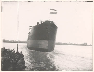 De tewaterlating van het schip de Stad Dordrecht.