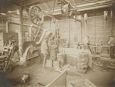 Het afbramen van gieterijproducten in de Meterfabriek.