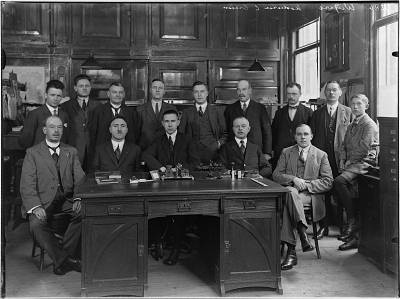 Groepsportret medewerkers distilleerderij fa. Wyers in de …