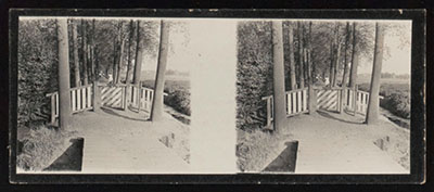 Stereofoto van het toegangshek tot het Boonepad aan de …
