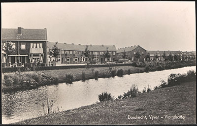 Vijver aan de Viottakade vanaf de Hollanderstraat (links) …
