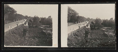 Stereofoto van het toegangshek tot het Boonepad aan de …