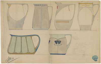 6 ontwerpen van melkkannen van de Dordtsche Kunstpotterij …
