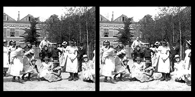 Stereofoto van een groep jeugdigen op het plein van de …