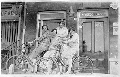Dames poseren voor het pand van scheepsbenodigdheden H. …