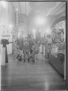 Groepsportret van 5 heren bij een stand van Underwood …