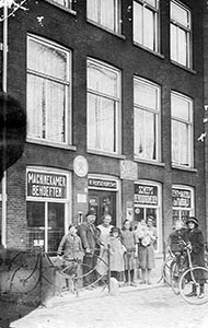 Poserende familie voor het pand van scheepsbenodigdheden …