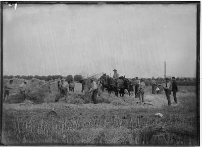 Landarbeiders dorsen handmatig koolzaad in de Dordtsche …