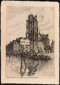 Tekening van de Grote Kerk gezien over de Bomhaven.