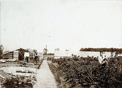 Tuinderij in de Watermolenweide met de schoorsteen van …