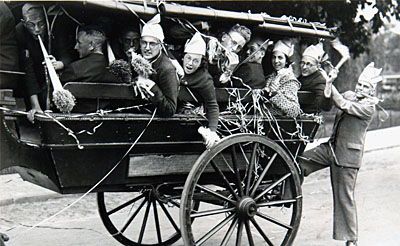 Geslaagde gymnasiasten rijden in een wagen door de stad.