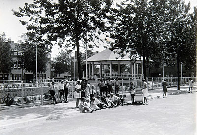 Kinderen op straat bij de muziektempel aan het Jozef …