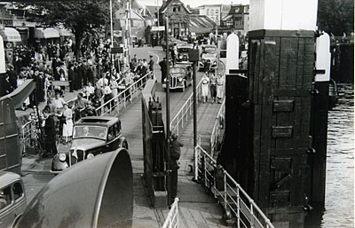 Pinksterdrukte, auto's en fietsers verlaten de pont aan …