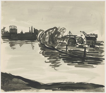 Riedijkshaven met werfjes en gashouder aan de Bleijenhoek.