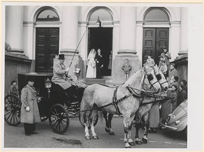 Trouwerij met koetsjes voor het stadhuis op het …