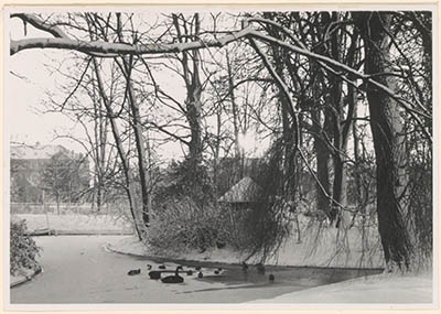 Vijver in besneeuwd Park Merwestein. Links op de …