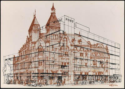 Ontwerpschets voor een nieuw postkantoor op de plaats van …