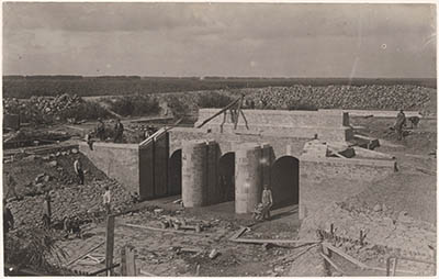 Bouw van de uitwateringssluis in de Zuidwestdijk naast de …