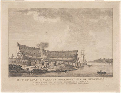 Het op stapel staande oorlogsschip De Hercules, gebouwd …