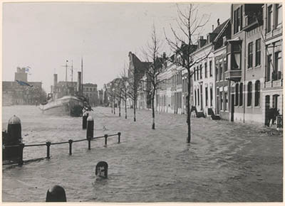 Hoogwater in de Wolwevershaven, gezien vanaf de …