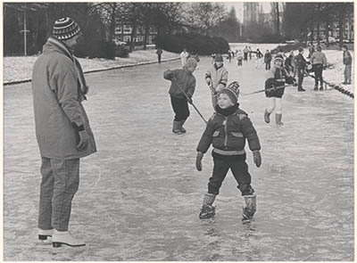Schaatsende en glijdende kinderen op het ijs van de …