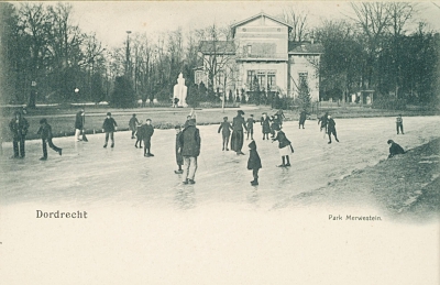 Schaatsers op een vijver in Park Merwestein. De fontein …