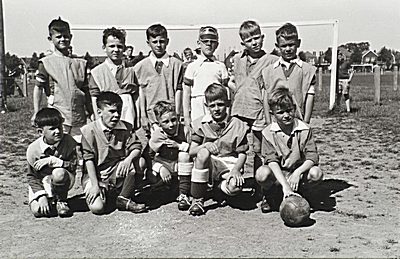 Jeugdelftal van DFC (met hesjes) op het achterveld van …