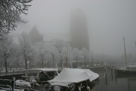 Maartensgat in de sneeuw, Grote kerk in de mist op de …