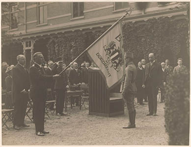 Vaandeluitreiking in de tuin van schouwburg Kunstmin door …