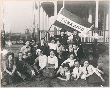 De toneelvereniging T.O.N.E.G.I.D.O. poserend met vlag …