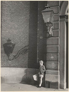 Jongetje met vlieger geleund tegen de muur naast de …