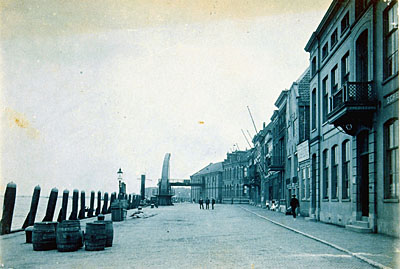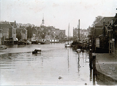 De Wijnhaven vanaf de Nieuwbrug richting Boombrug. Op de …