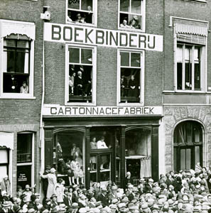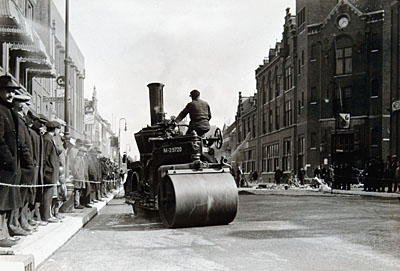 Toeschouwers bij het asfalteren van het Bagijnhof. Rechts …