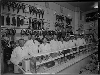 Interieur met personeel van slagerij Jan van der Straaten …