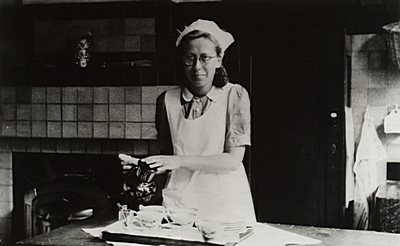 Een leerling van de huishoudschool schenkt koffie in voor …