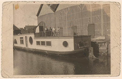 Woonboot met vier mannen aan dek in de Spuihaven bij de …