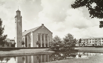 De Pauluskerk gezien vanaf de Nassauweg. De flats rechts …