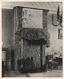 Interieur in een onbekend huis; een marmeren schouw met …