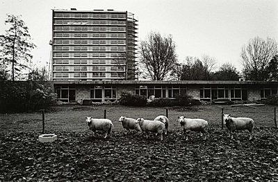 Schapen in Wielwijk. Het hoge gebouw staat aan de M.H. …