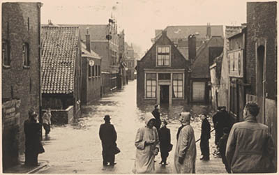 De Veststraat vanaf de Vest tijdens de watersnood. Links …