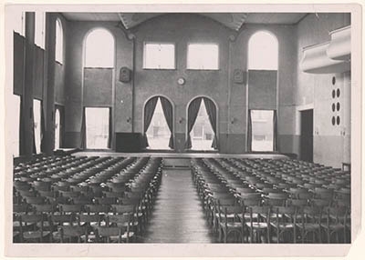 De voorzaal met losse stoelen, gezien naar het toneel van …