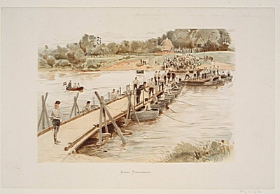 Het Korps Pontonniers bezig met het slaan van een brug …