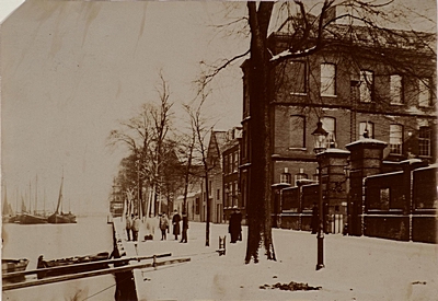 De Wijnhaven in de richting van de Nieuwbrug. Rechts …