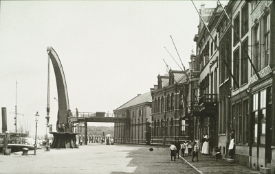 De Wolwevershaven vanaf het Vlak richting Damiatebrug. De …