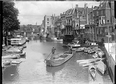 De Wijnhaven vanaf de Wijnbrug naar de Nieuwbrug. Links …