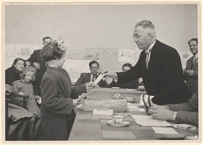Dr. Willem Drees bezoekt een bijeenkomst van de P.v.d.A. …